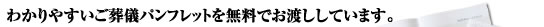 「価格や内容がわかりずらい」というお客様のご意見により、メモリアルホールでは「メモリアルセットプラン」の内容を写真や図表などでわかりやすく紹介したパンフレットをご用意しています。無料でお配りしていますので、お問い合せください。