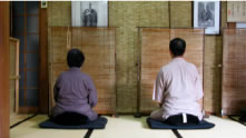 猛暑が終わりを告げ、ようやく朝晩過ごしやすくなった9月の初旬。早朝のお寺に作務衣を着た檀家さんが1人、また1人と集まってきます。まだ空は半分ほど朝焼けの綺麗なピンク色。鈴虫たちが鳴いている境内の砂利を踏みしめ、墨で大きな円が描かれた暖簾をくぐり本堂へ足を踏み入れると、目に入るのは背筋を伸ばし、ひたすら坐禅を組む姿。そこにはピンと背筋が伸びるような凛としたなかにも心が穏やかになる、そんな空気が漂っていました。